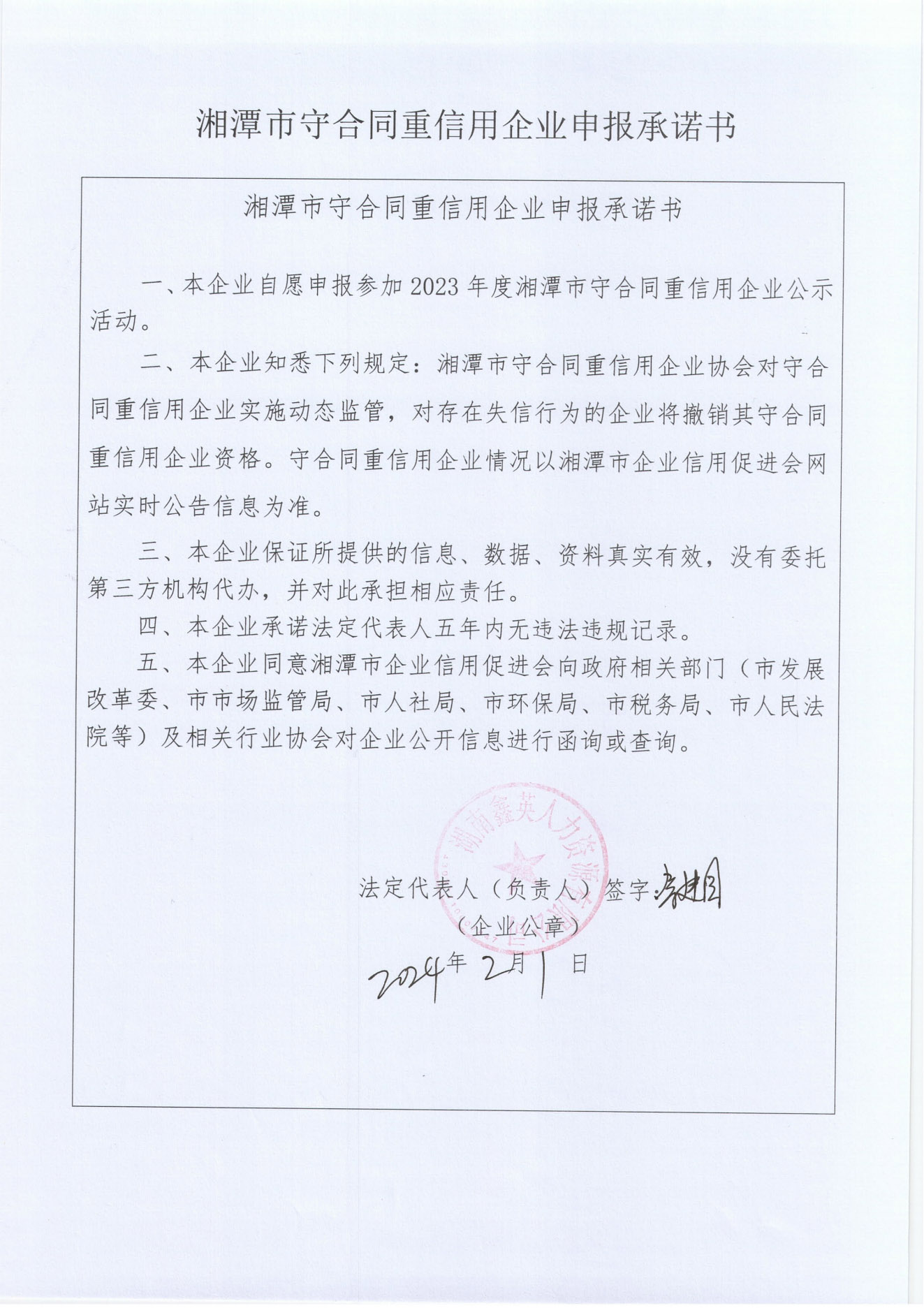 本企業(yè)根據(jù)《湘潭市守合同重信用企業(yè)申報規(guī)定》等編制 2023 年度企業(yè)信用報告書,并保證本報告書內(nèi)容真實、準確、完整。
